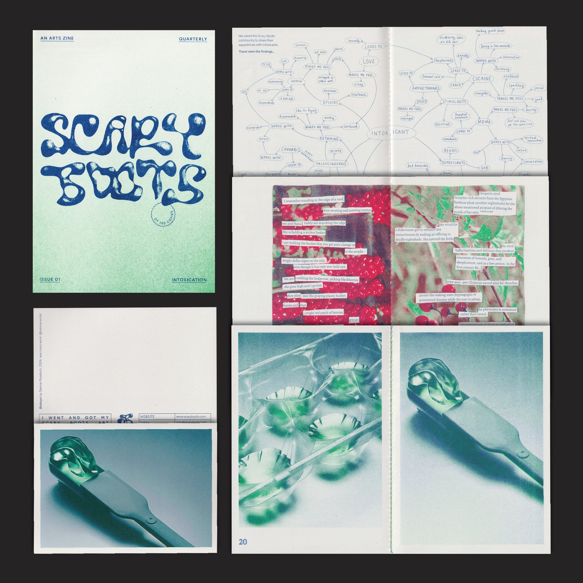 The first issue of Scary Boots zine invites collaborators to respond to the theme of intoxication. Featuring essays, prose, poetry, collage and photography on subjects including the mephedrone epidemic of 2009, drug addiction, the artistic merit of drug dealers' business cards and those forbidden red berries from childhood.
